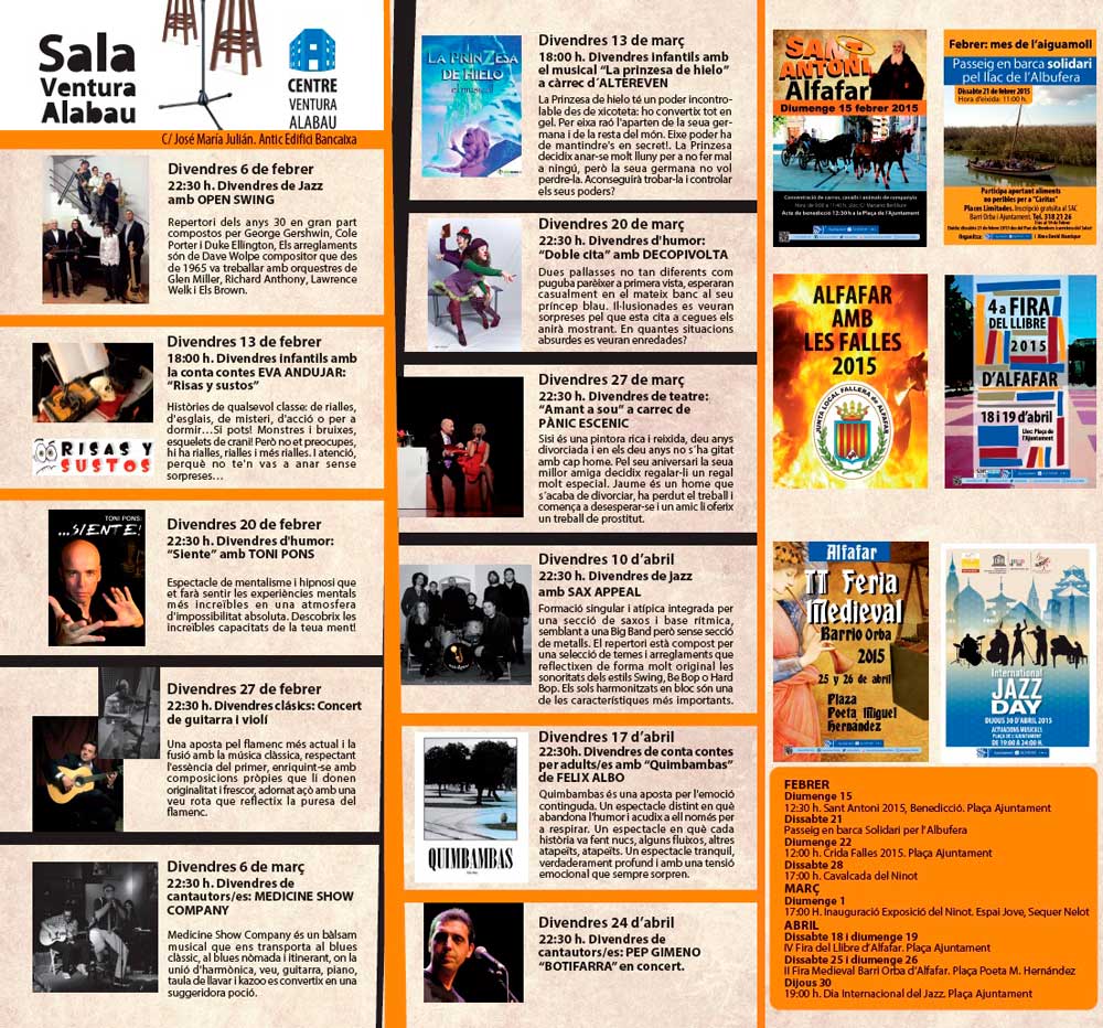 L’Ajuntament d’Alfafar ha organizado una serie de eventos y actividades culturales para los próximos meses que han sido recogidos en una Agenda Cultural que puede encontrarse en la web corporativa del consistorio, en las diferentes dependencias municipales y en establecimientos del municipio.